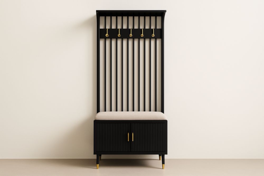 Guardaroba con 4 ganci in MDF nero e seduta in legno massello